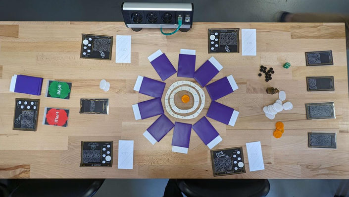 Le plateau de jeu est circulaire et comporte deux cadrans rotatifs, permettant aux joueurs d'interagir activement avec le plateau pendant la partie, influençant ainsi le déroulement du jeu. C'était une vraie envie de notre part.